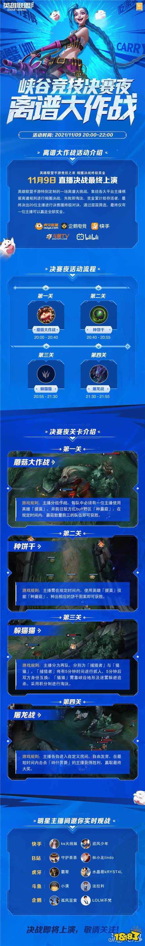 特别定制的一场离谱大挑战,决赛夜会将集结各大平台主播。来看看lol手游竞技决赛夜离谱大作战,直播决战最终上演。