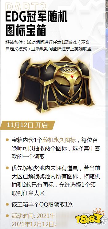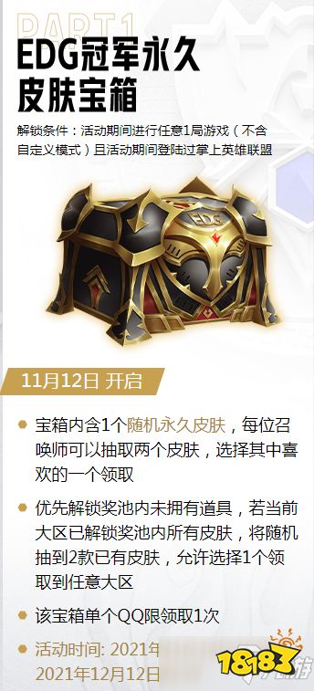 英雄联盟EDG夺冠活动皮肤宝箱什么时候能领皮肤活动的开启时间是11月12号。