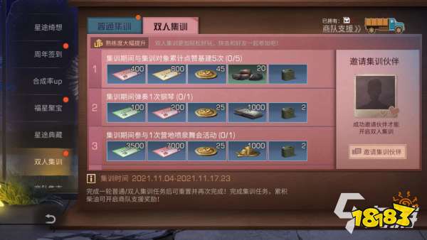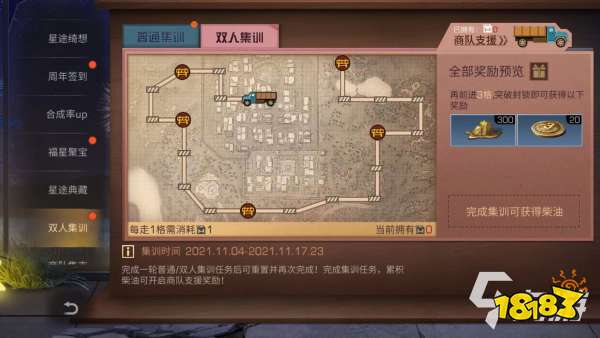 玩家进入游戏后,可以在主页面中中看到双人集训活动,其中包括参加普通集训和参加双人集训,集训时间在11月4日至11月17日,通过完成集训任务可以重置并重新完成,当完成集训任务后,可以累计柴油开启商队支援任务。