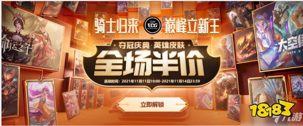 骑士归来,巅峰立新王!为庆祝EDG在2021英雄联盟全球总决赛中勇夺冠军,“英雄皮肤全场半价”,“冠军精选限定皮肤限时销售”与“海克斯皮肤半价兑换”活动将于2021年11月11日10:00开启,以下为活动详情。