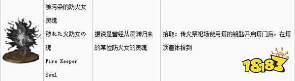 在游戏《黑暗之魂3》中,被污染的防火女灵魂作用是可以强化元素瓶的补血量,而且它还是重要的剧情道具,将被污染的防火女灵魂交给防火女后,防火女就可以治愈黑暗之环,玩家是不死人状态可以找防火女治疗,还可以花费大量的魂来恢复活尸状态。