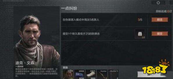 二个任务:在伪装潜入模式中淘汰5名敌人,提交1个耐久度低于25的防弹衣。