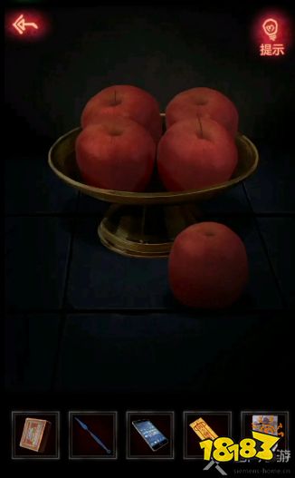 9、来到四楼大爷的遗像前,点击遗像再点开最上面的苹果,就会发现苹果尾部有一个红色的针,得到红色指针;