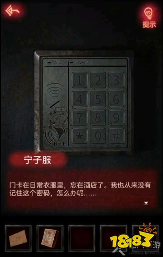 18、每一幅年画都是一个线索信息,首先返回地下车库,点击地上的箱子,财神爷年画是8楼,鱼的年画是2楼,鸡的年华是6楼,鹿角是5楼。密码是8265;