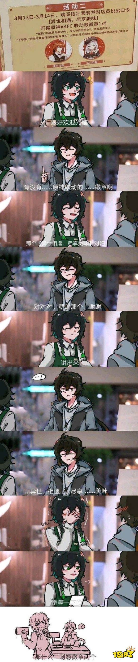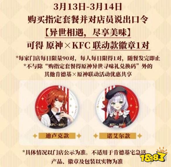 另外,在全国范围内有十余家原神主题KFC门店,主题门店有另外的活动:一是买指定套餐送限量明信片,二是与店员对暗号可以获取一对联动款徽章,暗号就是【异世相遇,尽享美味】。