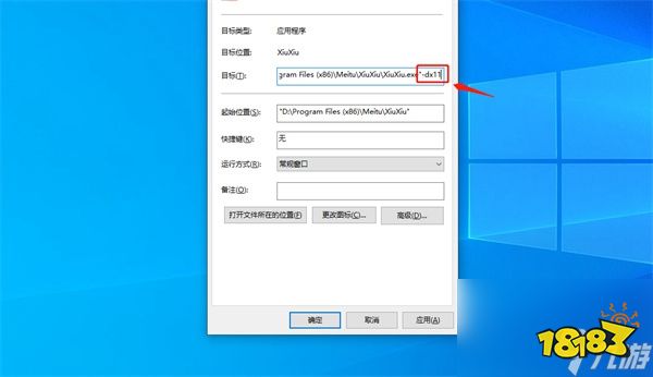 2、在属性中找到目标选项,在输入框中输入-dx11,注意原有的东西不要动,输入后进行保存。