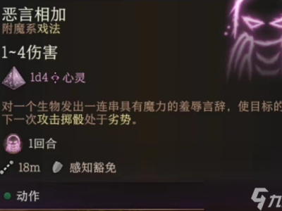 博德之门3恶言相加的主要作用就是对一个生物发出一连串具有魔力的羞辱言辞,这个伤害是能进行叠加的再次受到伤害的时候是能进行叠加总体上相当的不错。