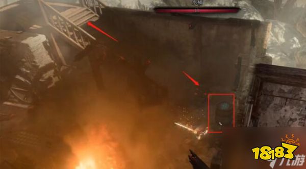 3、判定成功后进入房间,打破角落的水桶后左拐上楼,小心火焰。