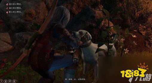 我们首先要点出动物对话这个技能,然后路上遇到狗的时候和它对话让他回营地。然后就可以怒搓狗头来涨队友的好感度了。