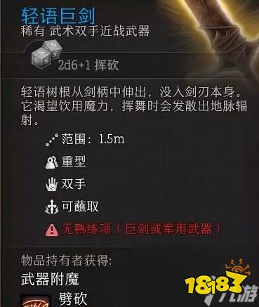 以上就是博德之门3巨剑获取方法介绍的全部内容了,希望可以帮到喜欢这个游戏的小伙伴,更多精彩内容请关注18183游戏。