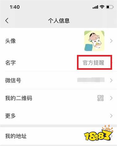 2、在个人信息页面中点击名字,将自己的名字设置为“官方提醒”;