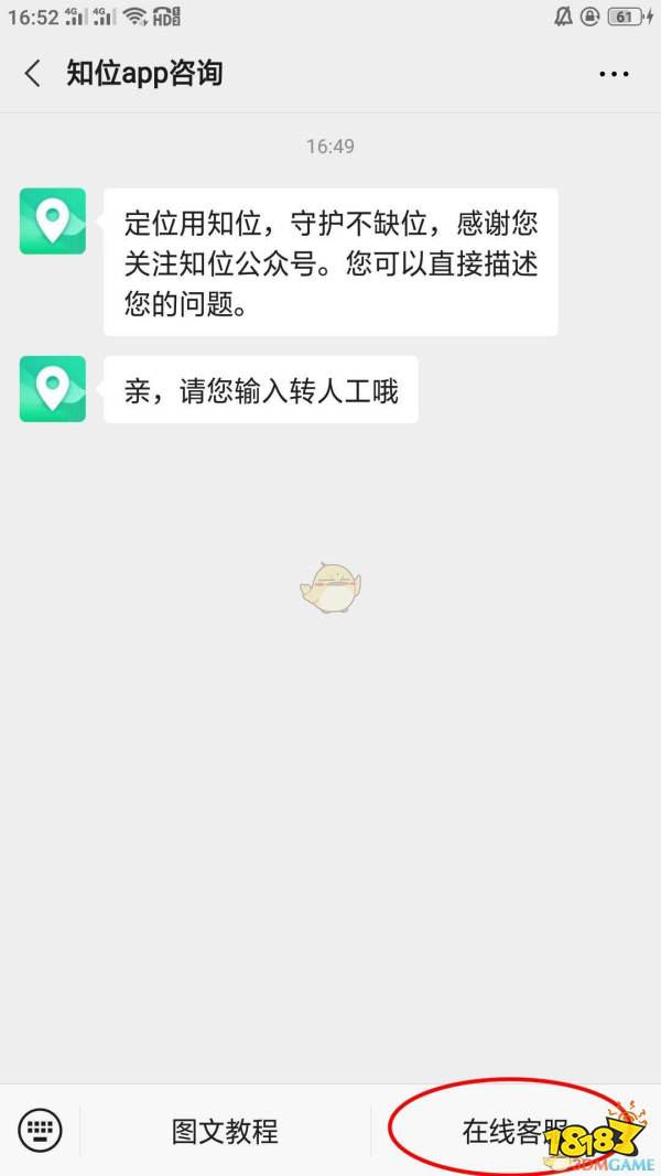 3、进入微信搜索关注知位,在对话框中点击右下方的在线客服。