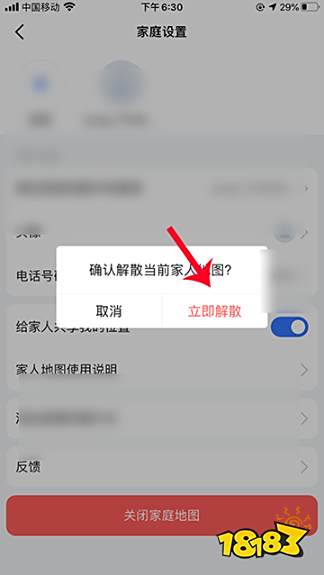 4、打开设置后,点击关闭家庭地图,选择立即解散就可以了。