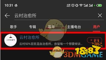 3、在搜索结果中切换到“用户”,全称为“云村治愈所”的用户,即为官方和志愿者组成的治愈服务号,点击此用户进入即可。