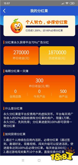 1、通过个人持续在应用内活跃,必得分红果(通过签到、邀请好友、观看视频、闯关升级可以促进活跃,使进度条达到100%后必得分红果,每天收益300元)
