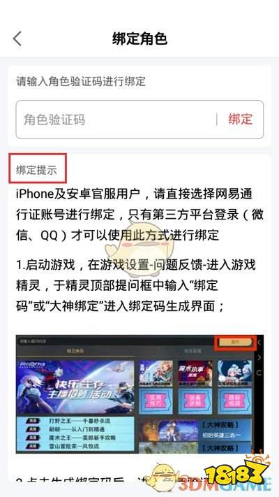 6、如果是渠道服,我们需要根据该游戏绑定渠道服的方式进行绑定,查看下方的绑定提示,按照提示绑定游戏(注意渠道服无法绑定oppo、vivo、华为等三个渠道服的角色);