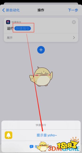 8、选择运行快捷指令,再次点击快捷指令,选择提示音yoho,点击下一步