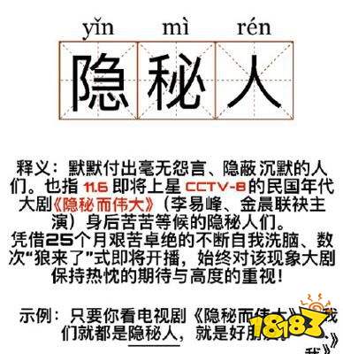最近有刷微博的小伙伴们可能就会看到【隐秘人】这个词,隐秘人意指默默付出毫无怨言隐蔽沉默的人们,也特指将于11月上星CCTV-8的民国年代大剧《隐秘而伟大》((李易峰和金晨主演)身后苦苦等待的隐秘人们,隐秘人,伟大魂,看隐秘的都是人上人!