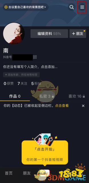 1、打开抖音app的我的界面,点击右上角的“三横”图标;