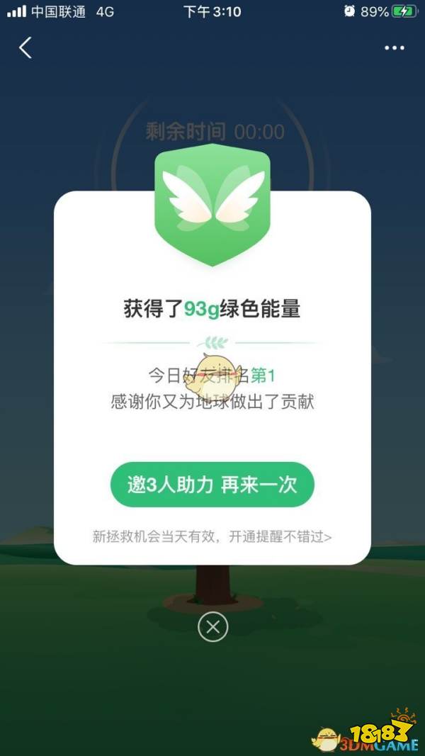 3.每个用户每天都默认有一次能量雨的机会,日常一天最多可以玩两次。第二次机会需要在每天第一局能量雨结束后,将能量雨分享给好友(可以通过微信,钉钉,微博,支付宝聊天等多渠道分享给好友),3位好友来到森林为你助力后可获得第二次机会;助力获得的额外机会仅当天有效。