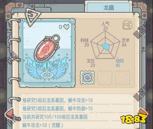 完成后,给20个龙晶的碎片:研究巨龙基因100级后,可+200攻击、+200防御;技能为高丽博物馆改造,置于高丽博物馆,赋予探索效果为蜗牛防御+20。觉醒后蜗牛攻击+50。