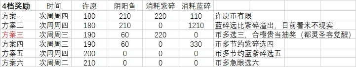 比如方案一意思就是需要使用180个许愿币,阴阳鱼消耗达到210才,每日礼包买到次周三拿到狗眼