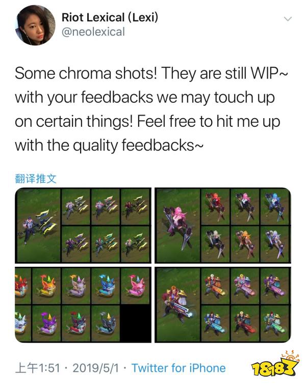拳头一位工作人员发布了推特公布了一些正在制作中的炫彩皮肤,包括新英雄悠米和战争学院系列中的三位。目前还在征集玩家们的反馈来继续作以改进。
